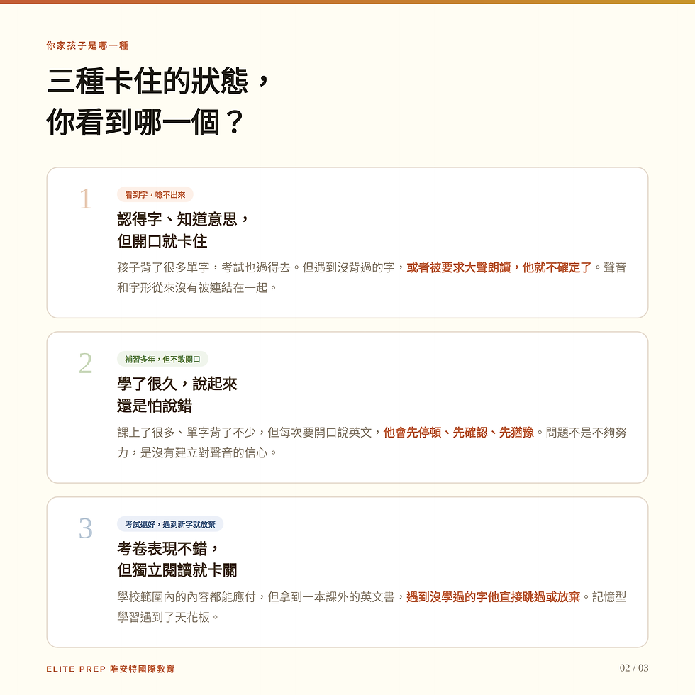 學英文學了好幾年,結果孩子站在那裡,看著一個沒背過的字,開口說「我不會唸」。
